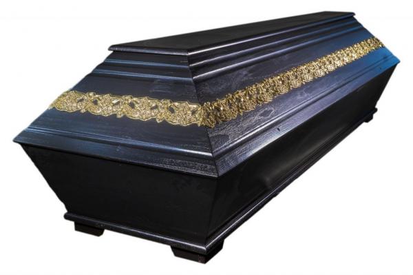 Moderní celodřevěná (paulovnie) rakev od českého výrobce, s krásnou povrchovou úpravou v barvách černě lakovaného dřeva. Vhodná do hrobu a ke kremaci, nevhodná do hrobky.