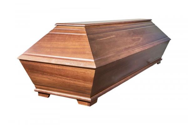 Moderní celodřevěná (paulovnie) rakev od českého výrobce, s krásnou povrchovou úpravou v tmavších tónech mořeného dřeva v barvách kaštanu. Vhodná do hrobu a ke kremaci, nevhodná do hrobky.