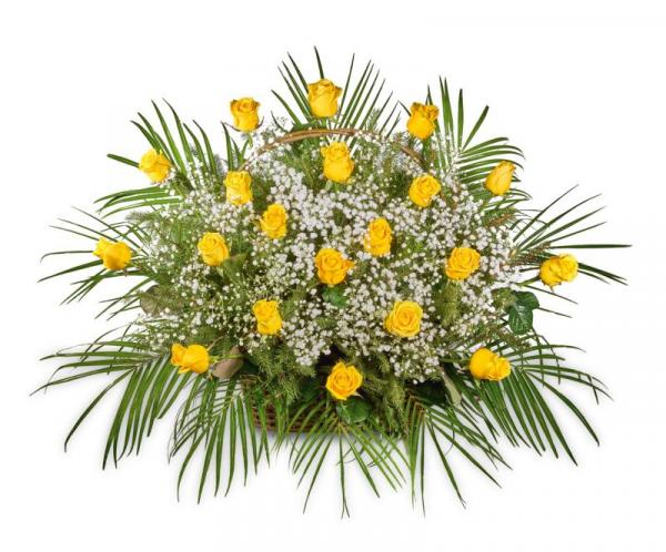 Květinový koš je vkusné a praktické aranžmá v proutěném košíku z růží doplněné vhodnou barevně laděnou přízdobou.