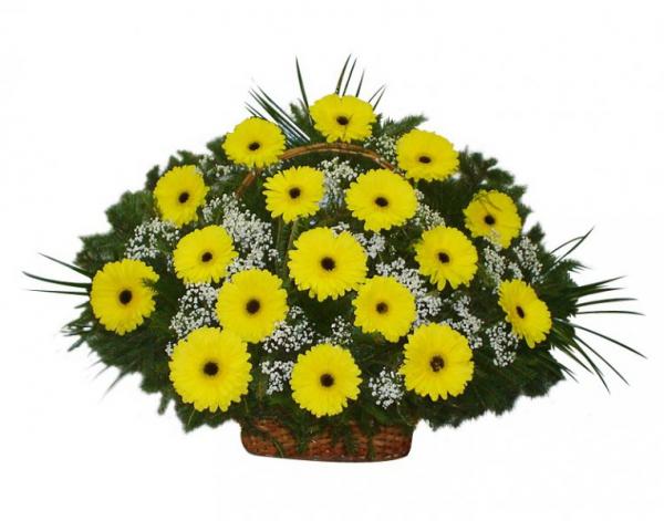 Proutěný košík z gerber doplněn přízdobou, s možností barevných variant. Je vhodnou a vkusnou volbou pro dekoraci před rakev nebo přímo na hrob. Je praktický a snadno přenosný.