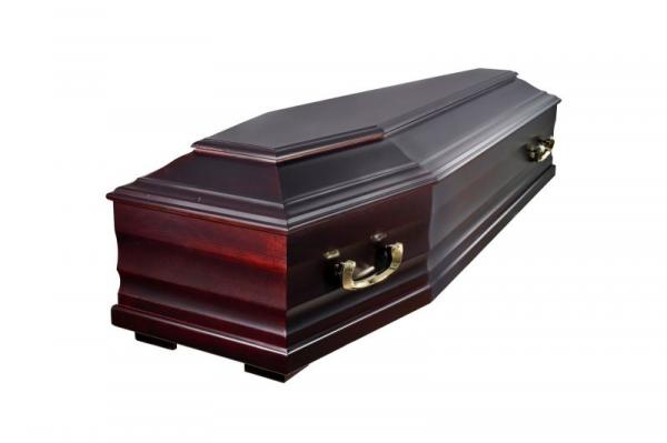 Kvalitní buková rakev tradičního tvaru v matné barvě, velmi dobře zpracovaná, tmavě mořené dřevo s matnou finální úpravou doplněné o masivní mosazná madla. Vhodná ke kremaci, do hrobu i hrobek.