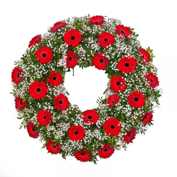 Luxusní smuteční věnec z živých gerber. Barevnost lze změnit dle aktuální nabídky, včetně mixu barev.
