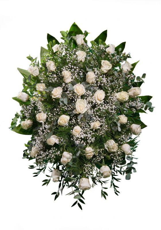 Květinové aranžmá je tvořeno růžemi, které vytváří převis přes rakev (vodopád květů).